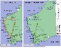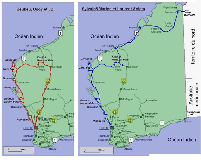 Parfois au péril de leur véhicule et souvent au détriment de toute hygiène. Oscillant entre la menace de la red back, le crochet du serpent, les dents du requin et la lutte acharnée contre les mouches, nos 2 équipes sillonnèrent une grande partie du nord-Ouest. Pour plus de clarté voici une petite carte des trajets respectifs.